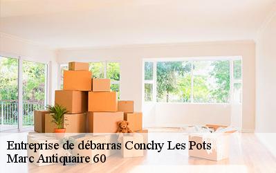 Spécialisée dans les services de débarras, notre entreprise Marc Antiquaire 60 propose ses prestations à Conchy Les Pots et ses environs. Qu'il s'agisse d'un débarras d'appartement, de grenier et de cave, de garage ou de locaux professionnels, nous nous engageons à vous satisfaire pleinement. Nous mettons notre expertise au service des particuliers et des professionnels. Forts de notre expérience, nous savons exactement comment procéder. De plus, nous possédons une variété de véhicules adaptés pour le transport des objets à débarrasser. Sachez que nous sommes disponibles à toute heure, à tout moment.
